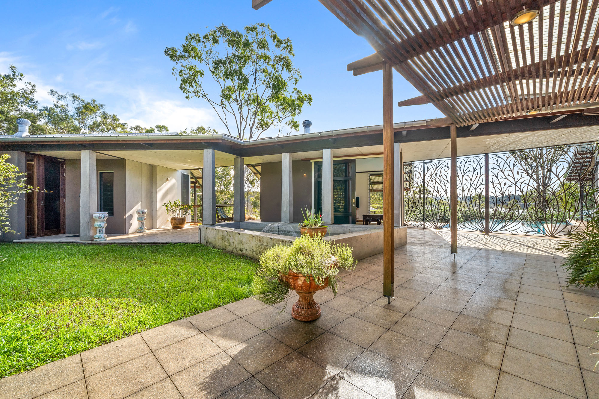 Surrounding the home we created a hand-forged wrought iron external feature screen and entry gates. Everything on this home is beautiful and custom, including extensive use of native Australian timber species, such as the use of recycled spotted gum on posts, stairs and the upper floor.